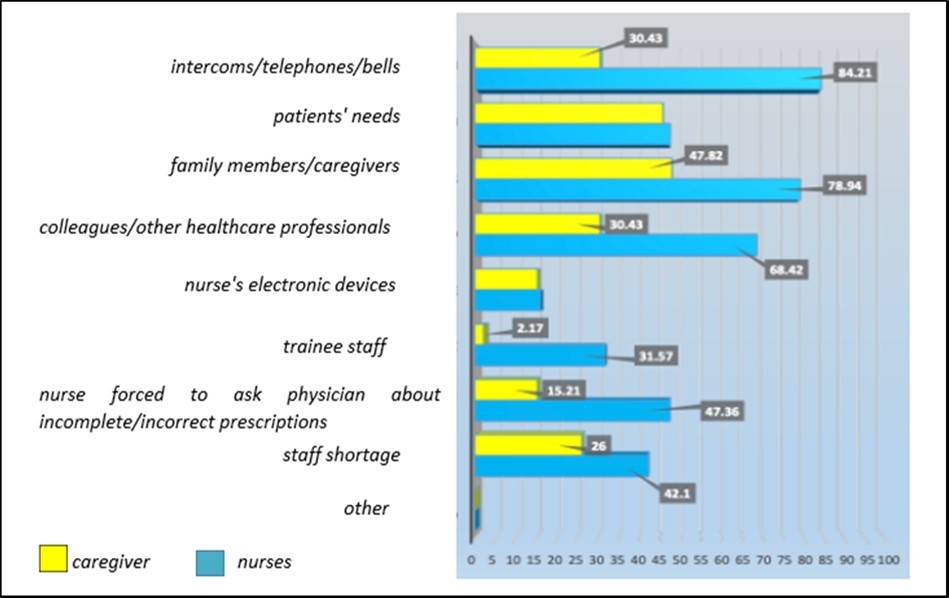 As can be seen from this graph, nursing staff and caregivers have opinions that sometimes converge and sometimes differ on what, according to them, are the main causes that lead nurses to distraction. More than 50% of nurses declare that it is the patient's bells, the ward intercom, family members and colleagues that cause most of their distractions during the moment of therapy, while only 47.82% of family members or patient caregivers think they be themselves a cause of nurse interruptions. On the other hand, nurses and caregivers seem to agree on distractions due to patient needs. In addition, nearly 50% of nurses feel distracted by the fact that they often have to step away from the therapy cart to ask the doctor about incomplete or incorrect prescriptions. graph 5