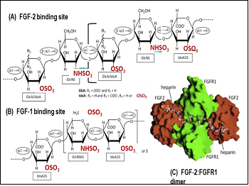 The (A) FGF-2 and (B) FGF-1 binding sites. Structural representations of Heparin (Hp) and Heparan         sulfate (HS) and their binding motifs proposed for (A) FGF-2 and (B) FGF-1. (A) The FGF-2 binding site is              proposed as the following pentasaccharide structure →4). (B) The FGF-1-binding site is proposed as the following pentasaccharide/heptasaccharide structure→4)-L-IdoA2S-α(1→4)-D-GlcNS6S-α(1 → 4)-L-IdoA2S-α(1→]. (C)          Molecular model of FGF-2-FGFR1-Hp-tetrasaccharide [Pellegrini et al (2000); Schlessinger et al (2000)]. The model shows the surface of FGF-2, the D2 domain and the Hp tetrasacchride (stick model). O1 and O4 indicates the reducing and non-reducing ends and the 2:2;2 molecular ratio of the complex components  The Hp ligands bind symmetrically on the canyon formed by the complex FGFR1 dimer-FGF-2-dimer In all panels the glycosidic bonds are indicated in ellipses whereas monosaccharide types are indicated in rectangles. Sulfation is highlighted in cyan. (This Figure is a modification of Figure 1B and 1C in Pomin VH Biochemie 127, 214-226 (2016) and Figure 4 in Schlessinger, J et al. Molecular Cell 6, 743-750 (2000) with permission from the publisher.