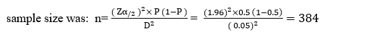 The required sample size was calculated for the dependent variable by using the single population proportion formula. The anticipated proportion of outcome (P= 50%) was taken because no previous study was done in under 18 years of children in Ethiopia. By considering CI= 95% and the margin of error (D) = 5% in order to increase the precision of the study. Hence, the required sample size was: