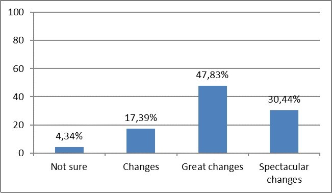 Of the 24 women who started this treatment, only one had to interrupt it. The interruption was not due to any side effect. Of the 23 women who received the 8 sessions, 1 (4.34%) reported not being sure of having noticed improvements in her skin; 4 (17.39%) reported noticing the changes, 11 (47.83%) reported noticing great changes and 7 (30.44%) reported spectacular changes (figure 3).