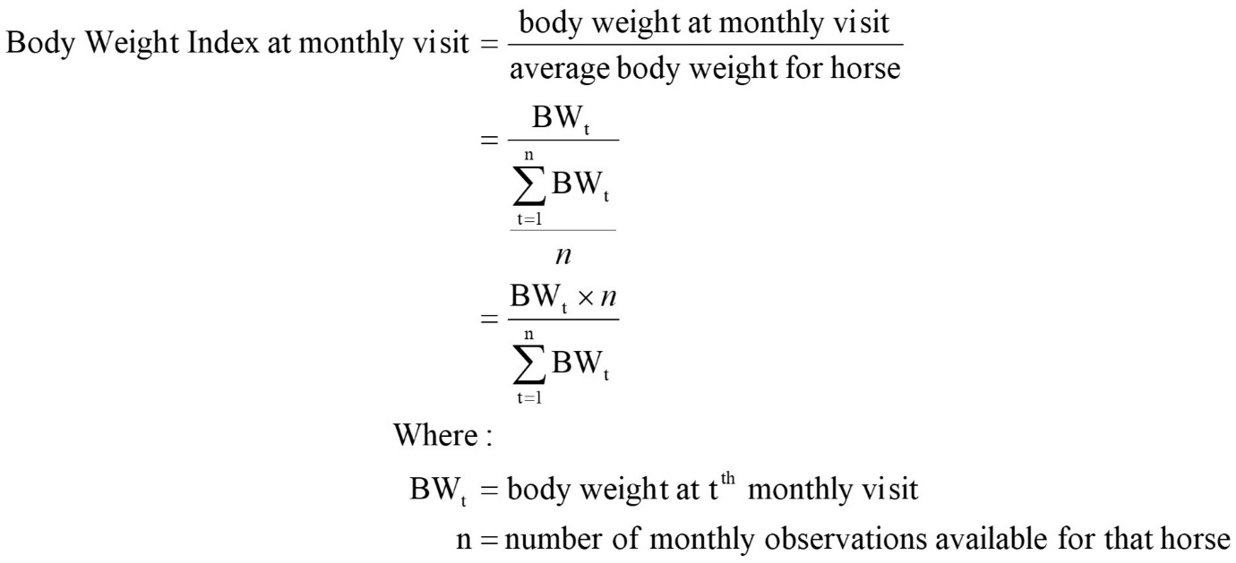 At each monthly visit, horses were led onto electronic portable live weight scales and their bodyweight was recorded in kilograms. To enable comparison of the bodyweight changes in horses of different frame size a bodyweight index was created by expressing each monthly bodyweight as a ratio relative to the average bodyweight of the horse over the duration of the study;