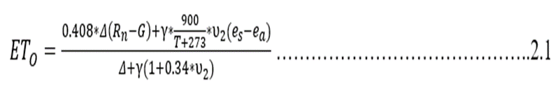 where: ETO: Reference evapotranspiration in mm/day, Rn: Net radiation at the crop surface in MJ m-2 day-1, G: Soil heat flux density in MJ m-2 day-1, T: Mean daily air temperature in °C, u2: Wind speed in ms-1, es: Saturation vapor pressure in kPa, ea: Actual vapor pressure in kPa, es - ea: Saturation vapor pressure deficit in kPa, D: Slope vapor pressure curve in kPa °C-1, and g: Psychometric constant in kPa °C-1.